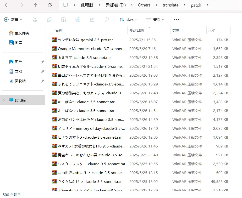 在使用了大概近10天的所谓无限额度claude后,发现不仅质量垃圾,乱窜模型,而且不能翻h部分,所以基本都放弃了。当时又不像现今一堆白嫖模型,而且还有gemini这种新的高质量模型用,陷入了机翻寒冬。然后gpt-4o-1120此时更新了,我成了试菜员,这个好像也是我第二阶段的第一个补丁?哦好像也不是,世界终结在前面好像,不过我最终没有发布这游戏的补丁,所以不算数。嗯,下面是我当时的项目,游戏名为《恋DOKi》,由于此时我还并不会正则,所以会很抽象。