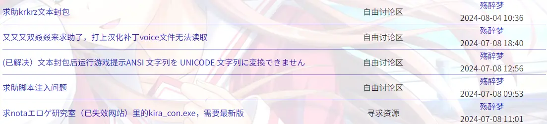 能拿出来说一下的补丁也就这几个了吧,其他的相对来说没这么累,或者游戏我不咋喜欢所以懒得说了。不过那会体验到的满足和优越感也不少,也是从英文名xusupervan换成常用id殇醉梦敢见人了,但当时啥也不懂,想了想玩机翻最快乐的时期也不是这会,做个补丁还担心自己修不了bug很痛苦。不过这个时期的补丁我基本都是自己全通过的,也可以说我玩过的自己补丁大部分来源于这个时期,补丁少的时候就很有责任感,想追求质量,人称和明显翻错都会改一下。大概玩了20来作的时候放弃了,觉得这样太累了,而且边玩边修bug真的很影响体验,算是顺势摆烂了。