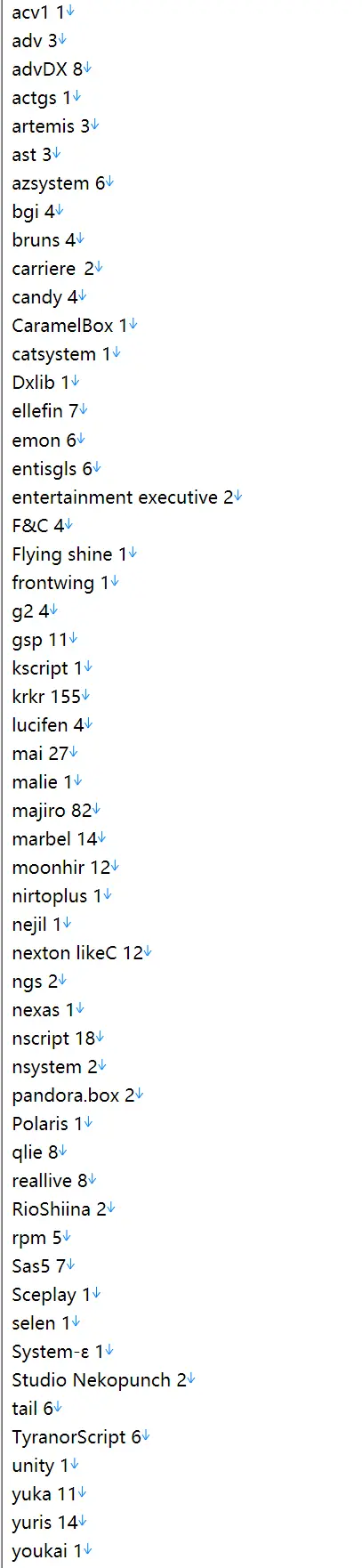 首先不得不提的是,这俩游戏的引擎——Majiro,也是我目前做过补丁数量第二多的引擎,第一当然是kr了,占了我所有补丁的近3分之1,干脆在这里放一下截至现在我接触过的所有引擎列表吧,排版什么的去死吧,说到这个我就想到上个月改毕业论文格式要死要活的日子了,真的无语。前几天统计了下,应该是55种引擎,后面的数字是做过的这个引擎补丁的数量,不过可能不太准,因为开始记录的时候已经做了200个补丁了?具体记不清了,不过这个不重要。