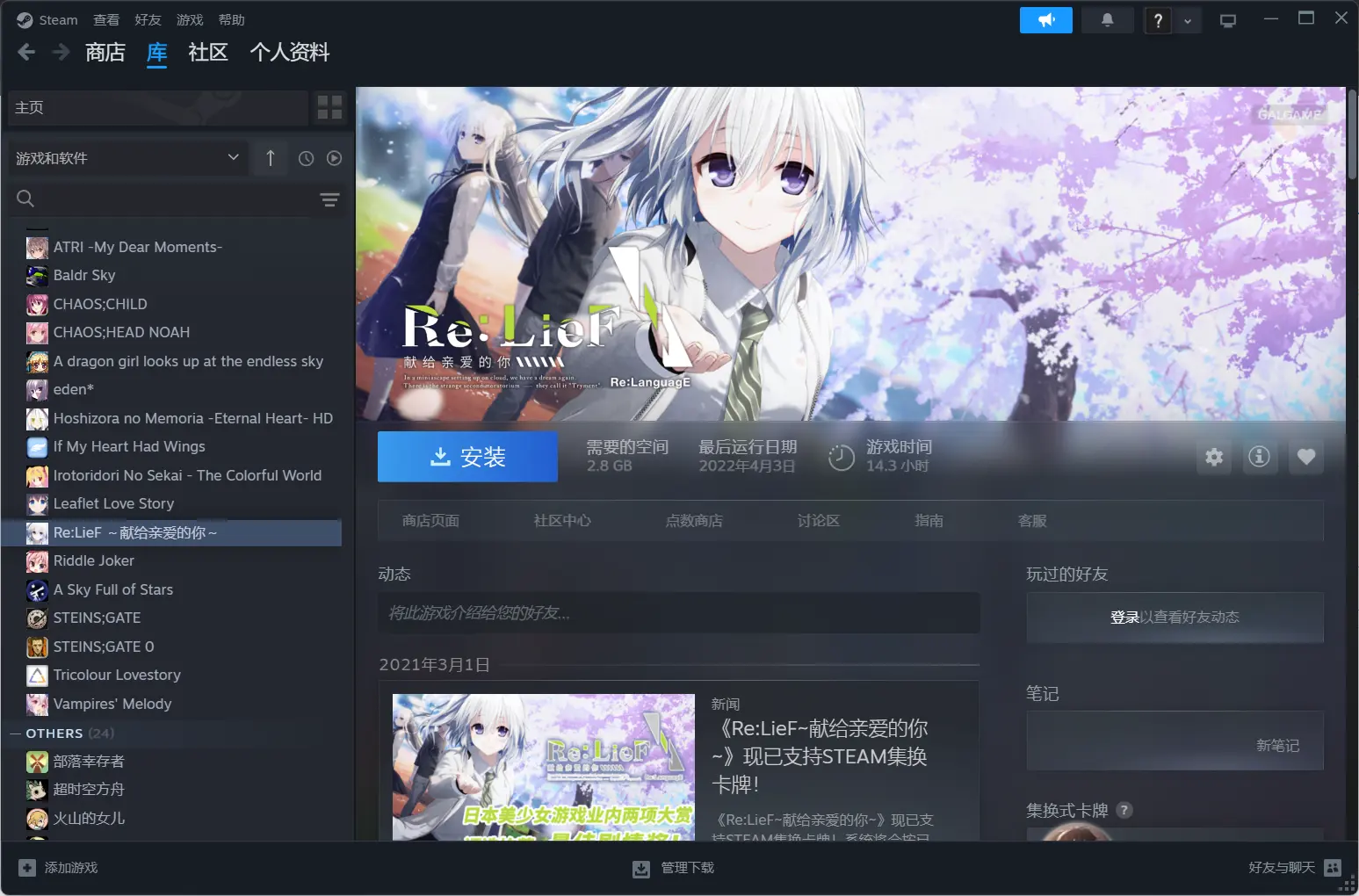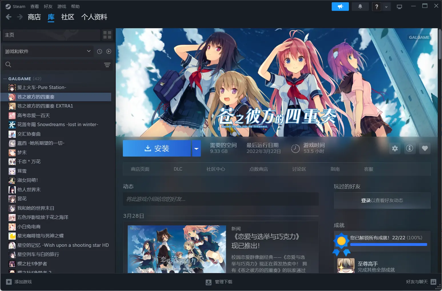 时间线有点记不清了,我到底是20年还是21年看的苍彼动画没印象了,大概是21年吧,因为正好接22年比较自然。当时看完苍彼动画还以为这是百合番,然后看见评论区说男主在动画里人畜无害,游戏全推倒了,嗯,又有了原始冲动。不过当时依旧没有电脑,所以仍然没玩上。接着到22年初,学校里上python课,在想玩gal的冲动和学业双重压力下,找爸妈求来了电脑。电脑是3月1日到的,然后当晚我就迫不及待地在steam上买了苍彼,不过消费记录我找不到了,不知道为什么。其实也可以看到我刚入坑玩了哪些游戏,基本是按这个顺序玩的,毕竟最开始因为不会找资源,然后自诩只玩正版所以只在steam上玩。
