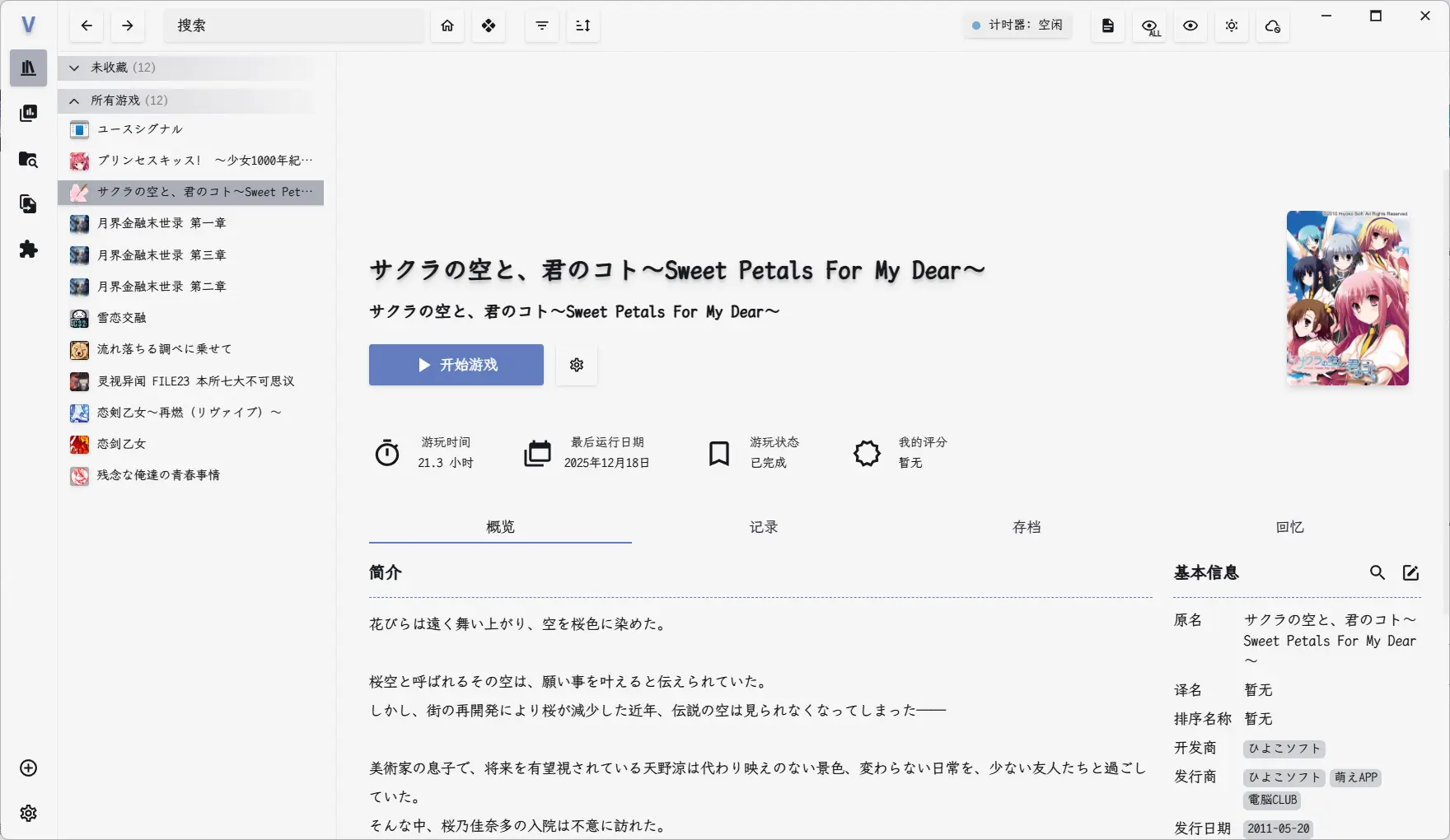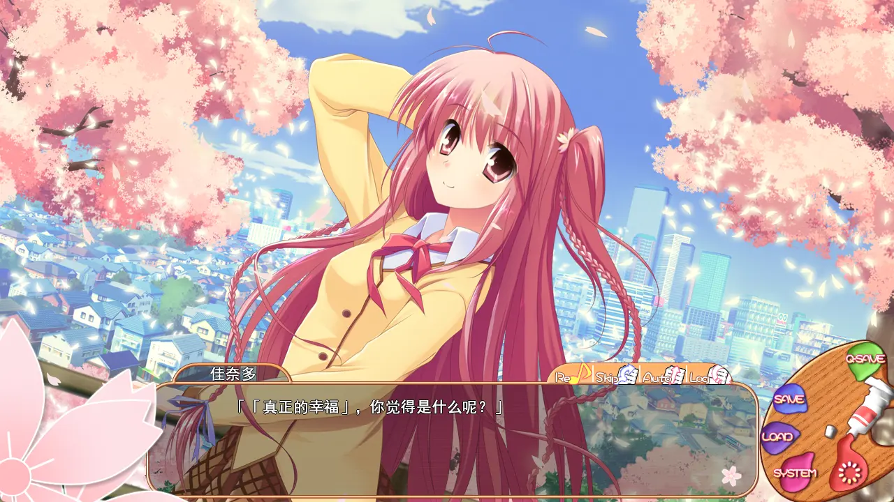 这次隔了近20天,本来这作都没打算写点东西的,但是删完游戏后发现这游戏也不是不能写点,遂下回来截图。这些天也没玩个什么,前半个月在苏州几乎全程感冒头疼,每天10点前就睡了,也是非常健康了。中途帮朋友做个机翻补丁结果因为自己犯蠢导致只能全程测一遍,所以本来早该打完这作的,一直拖到了现在。期间就打了《WORLD END ECONOMiCA》(金融题材,至少类型挺少见),《プリンセスキッス! ~少女1000年紀物語~》(基本是个拔作),《闇を奔る刃の煌き》(时代剧,但是最终转变为民俗,很烂)以及本作《サクラの空と、君のコト -Sweet Petals For My Dear-》。