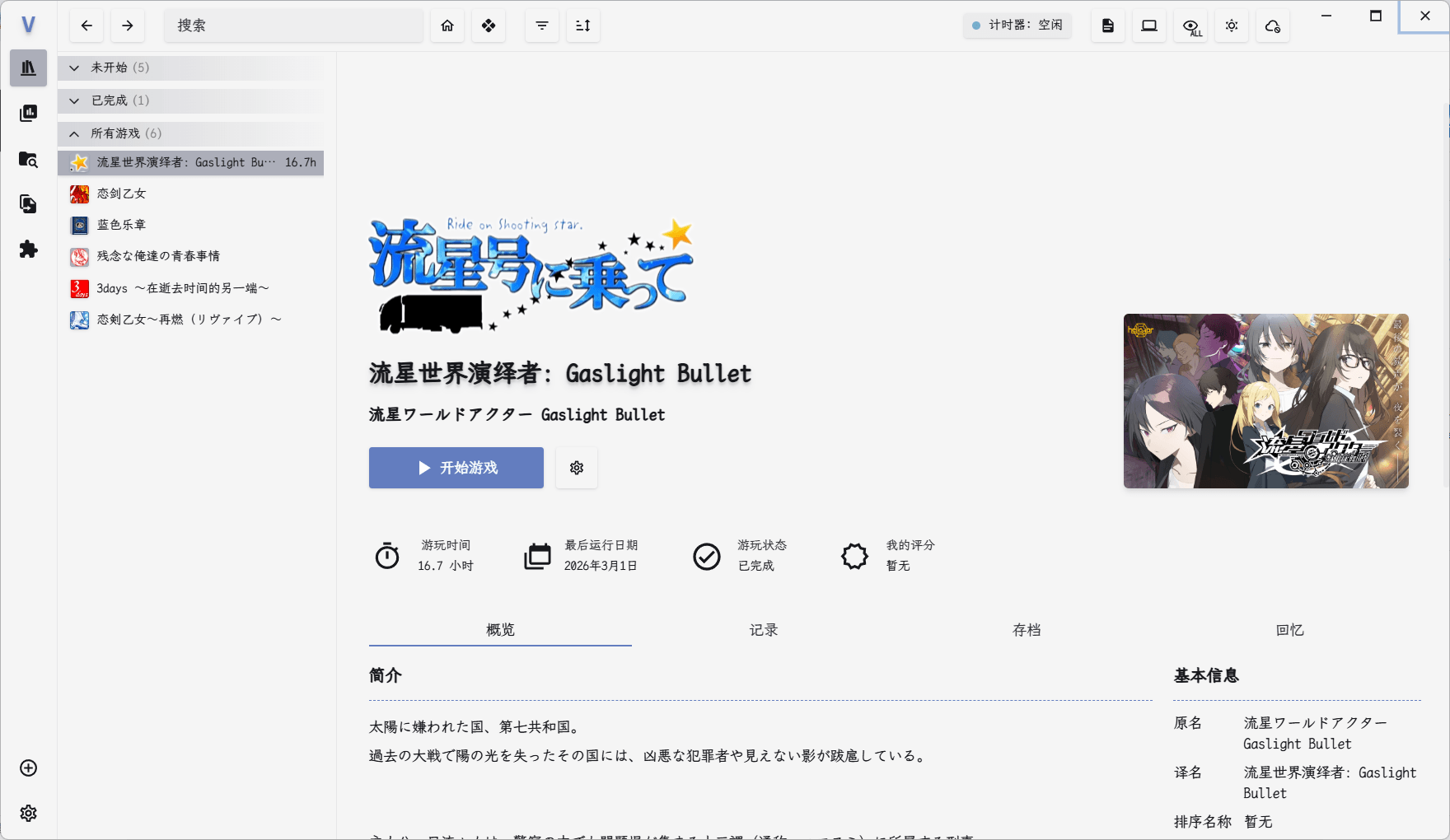 因为没隔几天,所以期间就打了一部4小时的同人《Smile Remaster ~スマイルリマスター~》(很正统的loop设定,所以很难差也很难好),然后就是本作《流星ワールドアクター Gaslight Bullet》。